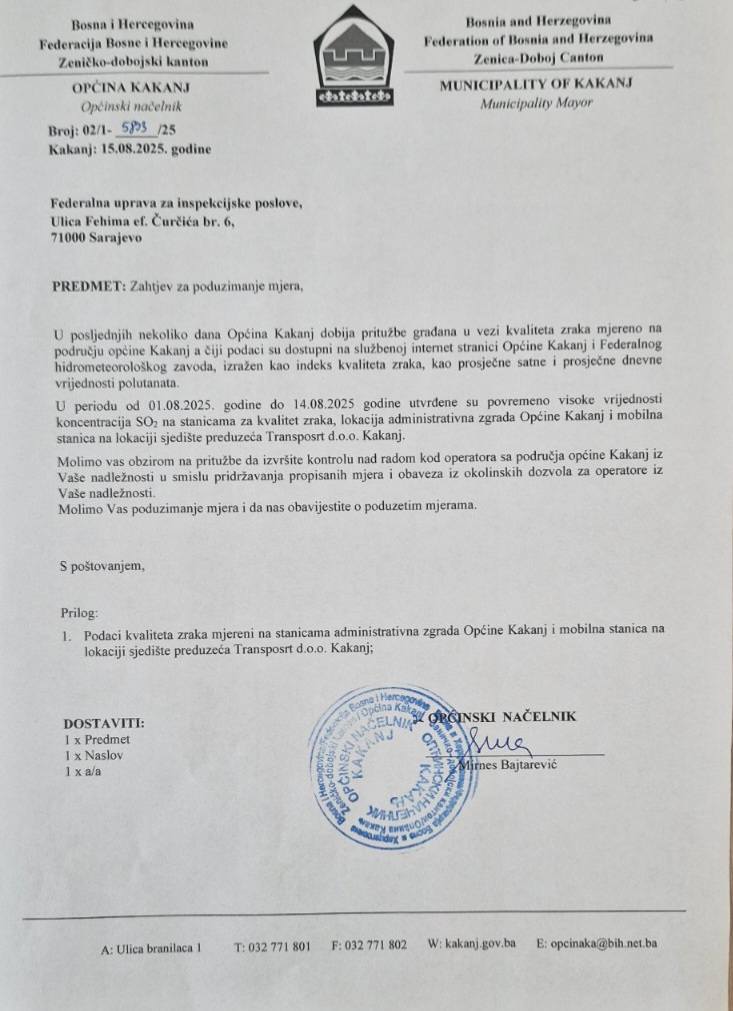 Nakon što je 15. augusta upućen zahtjev za poduzimanje mjera u vezi kvaliteta zraka u Kaknju, danas je nadležnoj federalnoj inspekciji upućena nova urgencija kojom se traži da se izvrši inspekcijski nadzor nad radom operatera na području Kaknja u smislu pridržavanja propisanih mjera i obaveza iz okolinskih dozvola.